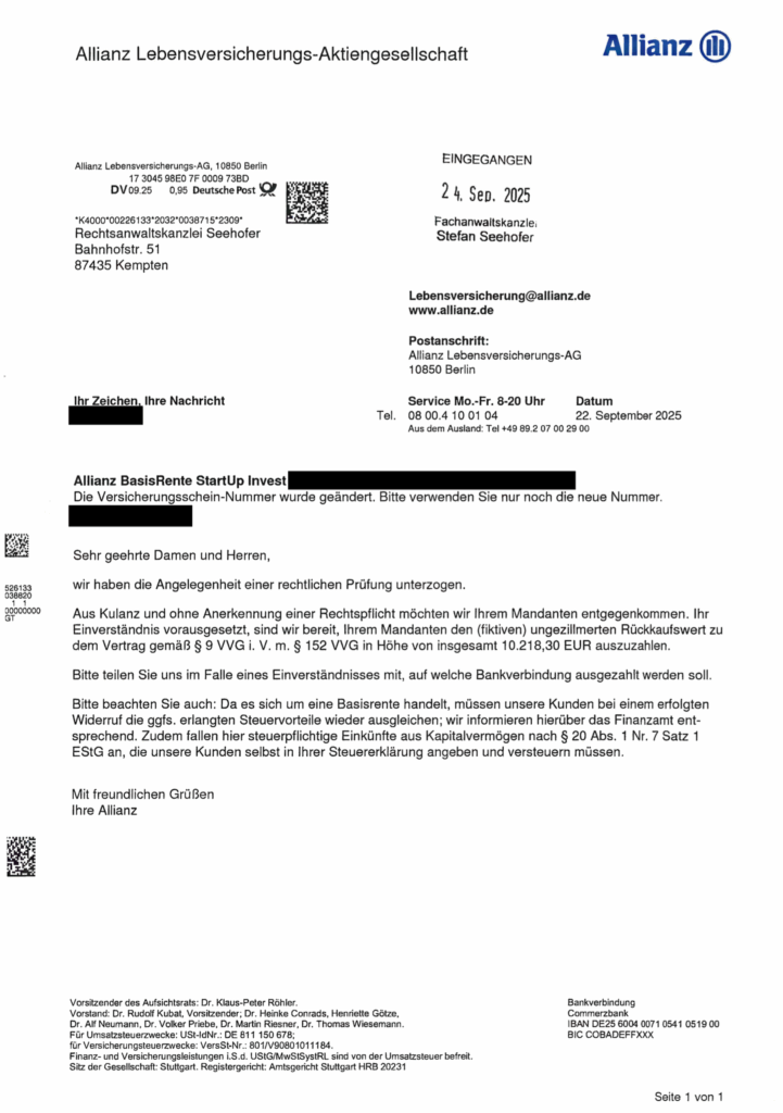 Unser Mandant hatte im Jahr 2008 die Allianz Basisrente StartUp Invest abgeschlossen und viele Jahre einbezahlt mit einem Monatsbeitrag von anfänglich 46,01 €. Zusätzlich war ein Berufsunfähigkeitsschutz vereinbart worden mit separat zu zahlenden monatlichen Beiträgen. Nach entsprechender Beratung durch unsere Kanzlei wurde sodann der gut begründete Widerruf des Basisrentenvertrages mit Schreiben vom 20.08.2025 erklärt. Gut einen Monat später erkannte die Allianz den Widerruf an und erklärte sich bereit, eine Auszahlung in Höhe von 10.218,30 € vorzunehmen. Unser Mandant kann sich somit über diesen Rückabwicklungsbetrag freuen anstatt eine im Jahr 2024 von der Allianz angekündigte Rentenzahlung von monatlich 28,30 € (!!) zum 01.07.2037 (!) zu erhalten.