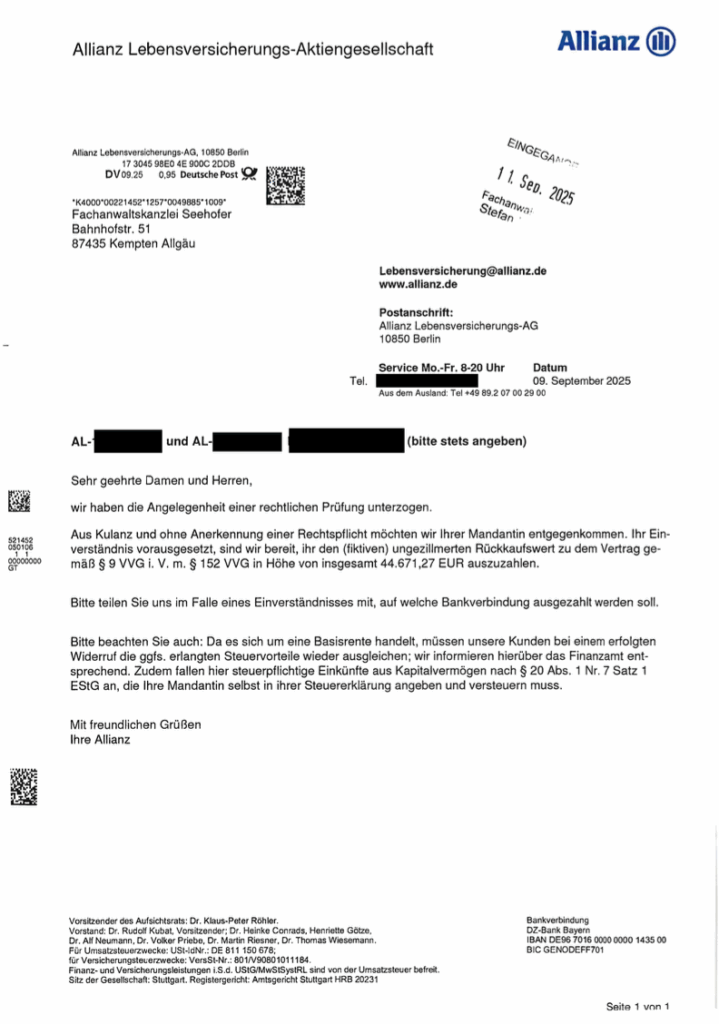 Unsere Mandantin hatte im Juli 2011 einen Basisrentenvertrag „Allianz BasisRente Klassik“ abgeschlossen. Nachdem der Vertrag viele Jahre bespart worden war, hatte unsere Mandantin dann den Vertrag beitragsfrei gestellt und war in den sozialen Medien auf die Informationen und Erfolge unserer Kanzlei im Bereich der Basisrenten-Rürup-Verträge aufmerksam geworden. Nach ausführlicher Prüfung wurde dann mit Schreiben vom 07.11.2025 der gut begründete Widerruf erklärt. Die Allianz entschloss sich schließlich nach etwa zwei Monaten, nämlich mit Schreiben vom 09.09.2025 dazu, den Basisrentenvertrag, der mittlerweile eine andere Versicherungsnummer erhalten hatte, rückabzuwickeln. Unsere Mandantin kann sich nunmehr über eine Auszahlung von knapp 44.700,00 € freuen und somit einen höheren Betrag als die von ihr einbezahlten Beiträge.