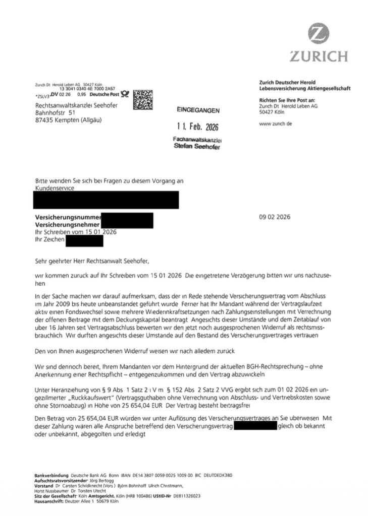Der Widerruf wurde sodann mit Schreiben vom 15. Januar 2026 erklärt. Die Zurich erklärte sich gut drei Wochen später, nämlich mit Schreiben vom 9. Februar 2026, bereit, die Rückabwicklung vorzunehmen, sodass sich unser Mandant über einen Auszahlungsbetrag von knapp 25.700,00 Euro freuen kann.