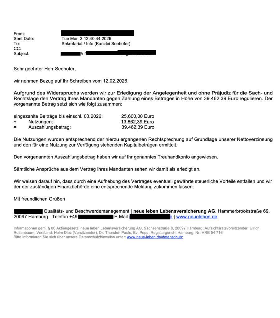 Nach Beratung durch unsere Kanzlei wurde mit Schreiben vom 12. Februar 2026 der Widerruf wegen fehlerhafter Widerrufsbelehrung erklärt; die Neue Leben Lebensversicherung erkannte den Widerruf mit E-Mail vom 3. März 2026 an und erstattete nicht nur die einbezahlten Beiträge von 25.600,00 €, sondern darüber hinaus auch noch Nutzungen i.H.v. 13.862,39 €, sodass sich ein Auszahlungsbetrag von 39.462,39 € ergab.