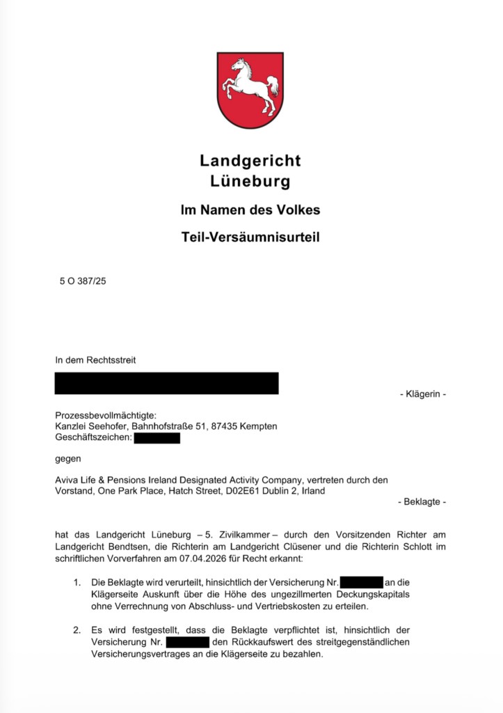 Nunmehr gibt es auch bei der jetzigen Aviva Life & Pensions Ireland Designated Activity Company, der früheren Friends Provident ein erfreuliches Gerichtsurteil im Zusammenhang mit der Rückabwicklung eines im Jahr 2012 abgeschlossenen Basisrentenvertrages mit der Bezeichnung: „Friends Planbasic“: Das Landgericht Lüneburg hat in einem Teil-Versäumnisurteil die jetzige Aviva zur Auskunft verurteilt und dabei festgestellt, dass eine generelle Verpflichtung der Aviva besteht, den Rückkaufswert dieses Versicherungsvertrages an unsere Mandantin zu bezahlen. Dieses Teil-Versäumnisurteil ist umso bemerkenswerter, als das Urteil einen Basisrentenvertrag der früheren Friends Provident aus dem Jahr 2012 betraf. Derartige Verträge sind nicht ohne weiteres rückabwickelbar, sodass die nunmehrige Entscheidung des Landgerichts Lüneburg einen Meilenstein darstellt und somit auch die Rückabwicklung weiterer Verträge, die bei der früheren Friends Provident, der heutigen Aviva abgeschlossen wurden, erleichtern dürfte.