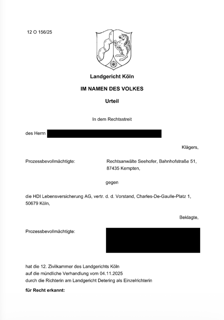 Landgericht Köln verurteilt im Dezember 2025 die HDI Lebensversicherung zur Rückzahlung aller einbezahlten Beiträge