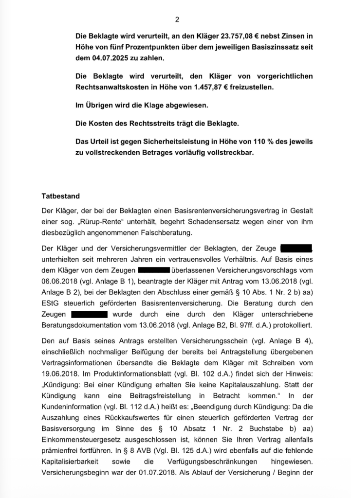 Das erfreuliche und im übrigen rechtskräftige Urteil des Landgerichts Köln gegen die HDI (die HDI ist wohl aus gutem Grund nicht in die Berufung gegangen!) zeigt, dass oftmals nicht nur ein Widerruf durchgesetzt werden kann bei Basisrenten / Rürup-Verträgen, sondern Ansprüche auch im Wege des Schadensersatzes wegen Falschberatung durchsetzbar sind.