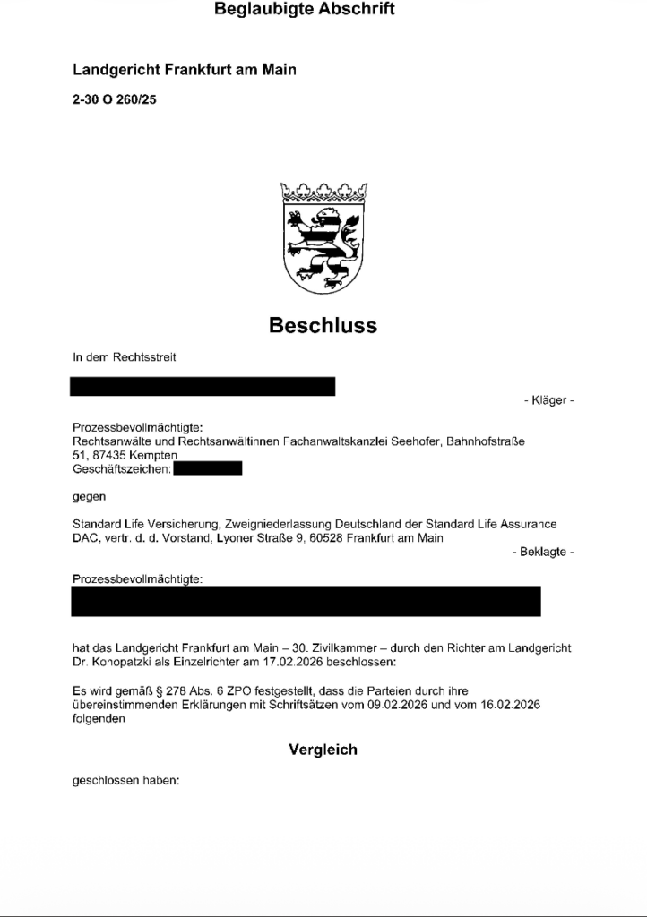 Das Gericht machte in der mündlichen Verhandlung vom 12. Januar 2026 deutlich, dass es der Klage stattgeben würde. Daraufhin zeigte sich die Standard Life vergleichsbereit und verpflichtete sich zur Zahlung des gesetzlich vorgesehenen Rückabwicklungsbetrags von insgesamt 9.841,10 €. Der Rückabwicklungsbetrag setzte sich aus dem Rückkaufswert zum Zeitpunkt des Widerrufs in Höhe von 6.987,52 € sowie den Abschluss- und Verwaltungskosten in Höhe von 2.853,58 € (!!) zusammen.